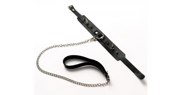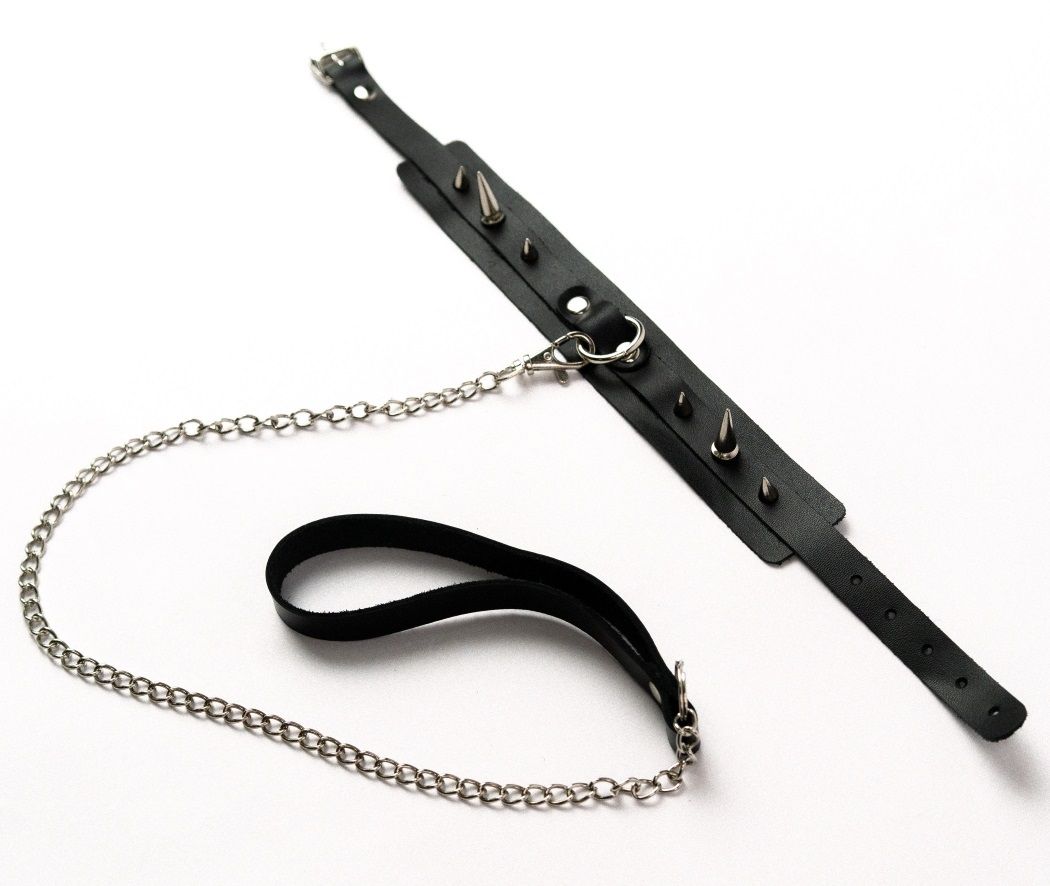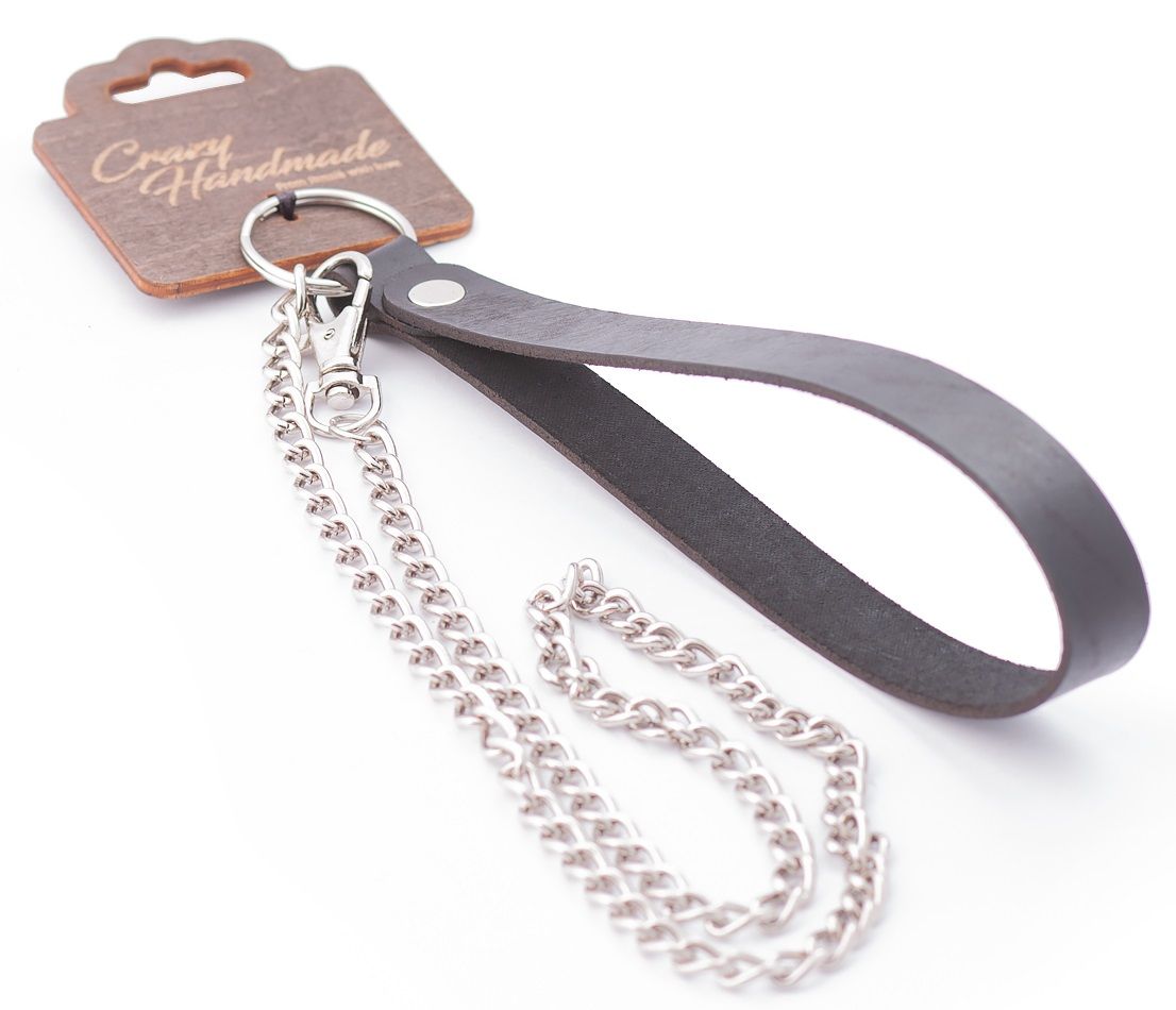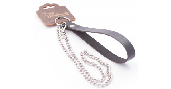 Серебристый металлический поводок с кожаной черной ручкой - 80 см.