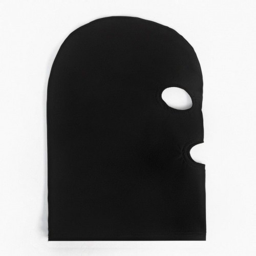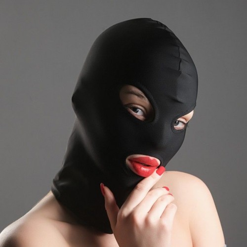 Черная эластичная маска БДСМ с прорезями для глаз и рта.