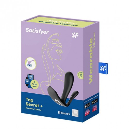 Носимый вибратор Top Secret+ имеет плоское эргономичное основание, обеспечивающее максимальный комфорт, а также ребристый стержень для клиторальной стимуляции. Этот вибратор, с бонусным стержнем для анальной стимуляции, эргономично изогнут, чтобы идеально воздействовать на точку G. Испытайте сильные вибрации благодаря каплевидной форме. Через Bluetooth Top Secret+ подключается к отмеченному наградами бесплатному приложению Satisfyer Connect, что предоставляет вам возможность независимо управлять двумя моторами и настраивать вакуум-волновое воздействие и вибрации на ходу. Top Secret+ изготовлен из безопасного для тела силикона, работает от аккумулятора и имеет степень водонепроницаемости IPX7. Диаметр отростков - 3 и 1,7 см.
