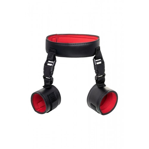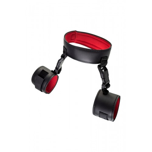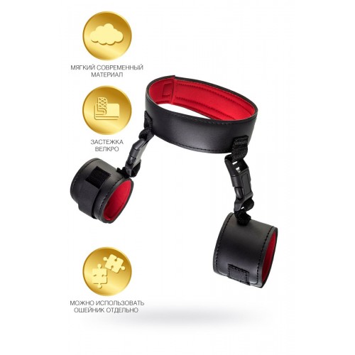 Современный комплект из мягкого материала комфортно обовьет шею и ограничит свободу рук. Застежка велкро (липучка) дает возможность использовать его партнером любого размера, так что меняйтесь ролями в зависимости от настроения! Пластиковые карабины на ошейнике и наручниках надежно фиксируют руки совсем рядом с шеей, не оставляя никакой свободы действий. С таким комплектом ограничить движения партнера легко в любом месте. Этот строгий аксессуар скрывает внутри страстный красный цвет так же, как вы скрываете свое увлечение БДСМ в обычной жизни. Управляйте друг другом, ограничивая свободу партнера, но не ограничивая своих сексуальных желаний. Длина ошейника - 44 см., ширина - 4,5 см. Длина наручников - 22 см., ширина - 6 см.