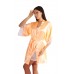 Короткий кокетливый халатик покроя "кимоно" из однотонного искусственного шелка, с запахом под пояс. Рукава широкие, длиной три четверти, с удлинённой проймой, по низу отделаны изысканным ажурным кружевом с фестонами. На спинке выполнена декоративная вставка в форме сердечка из ажурного кружева.
