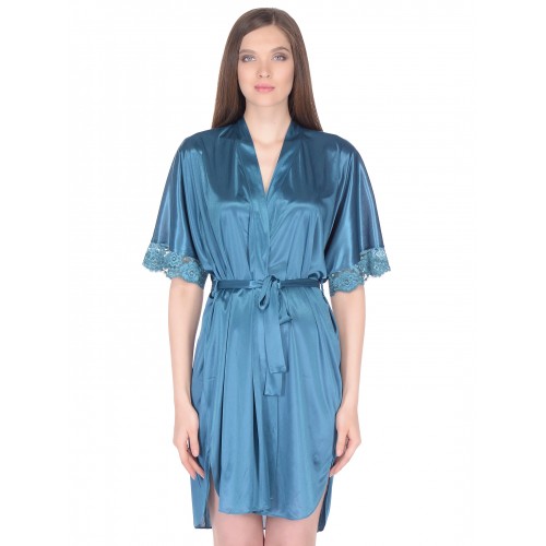 Короткий халатик из шелковистого трикотажного однотонного полотна; прямого силуэта, свободного покроя, с запахом под пояс. Цельнокроенный короткий рукав по низу отделан эластичным кружевом в тон. По бокам закруглённые разрезы. Длина 92 см.