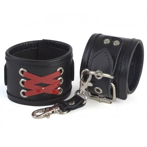Аксессуар состоит из двух широких полос из плотной натуральной высококачественной кожи черного цвета, украшенных контрастной шнуровкой из красных лаковых лент, соединенных между собой снимающейся короткой сцепкой в виде карабинов. По краю наручников проходит оторочка, обеспечивающая комфорт при ношении. Оденьте наручники на запястья и с помощью никелированных пряжек зафиксируйте ремни. Ширина - 5,3 см.