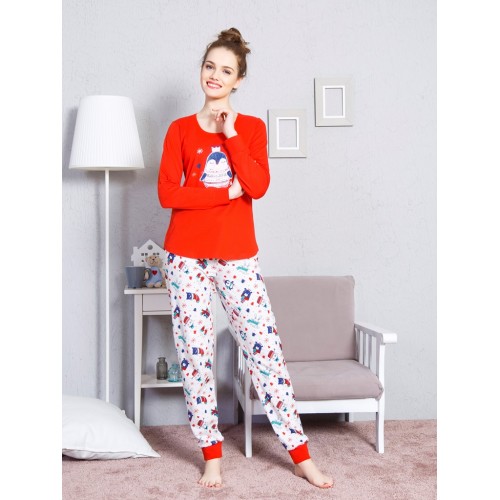 Прекрасный домашний комплект для отдыха. Кофта с длинными рукавами и круглым вырезом. Представлена в яркой расцветке и декорирована принтом с пингвином на груди. Брюки с узором светлой расцветки - низ комплекта. Модель удобного фасона дополнена манжетами на щиколотках и эластичным поясом на талии.