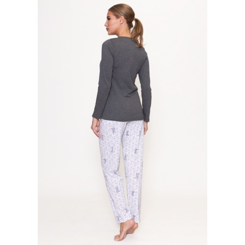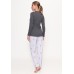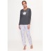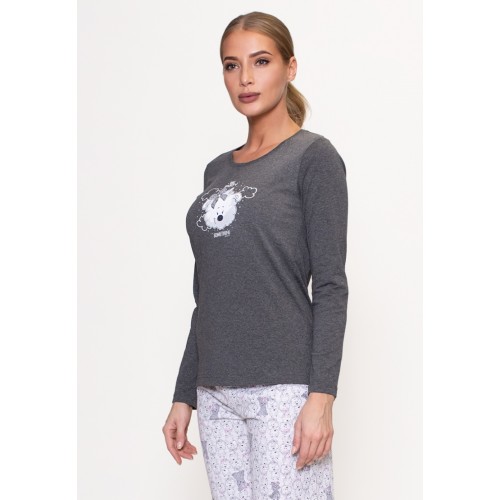 Домашний комплект-двойка приятной нежной расцветки произведен. Кофта с длинными рукавами и круглым вырезом горловины. Модель украшена рисунком с болонкой на груди. Низ - свободные брюки с узором по всему полотну. Модель имеет эластичный пояс на талии для фиксации. Комплект высокого качества надолго сохранит свой привлекательный внешний вид.