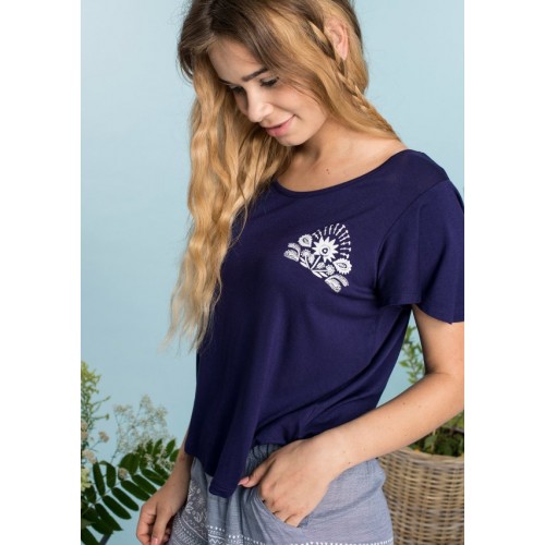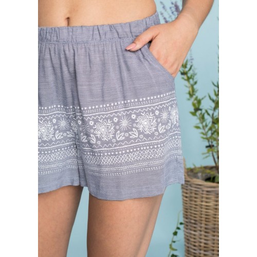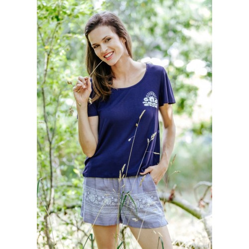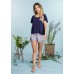 Комплект женский для дома и отдыха LNS 576 A20 от европейского производителя KEY. Футболка сводоного кроя, с круглым вырезом в области горловины, рукав-волан, принт на груди в мотиве цветка. Шорты свободного кроя, на резинке, с карманами.