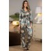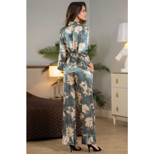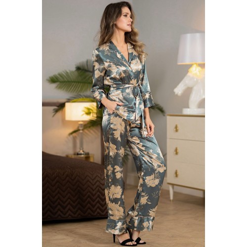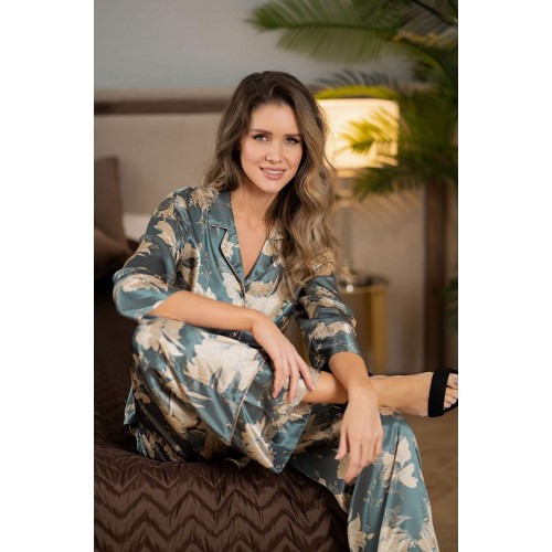 Комплект Mia-Amore состоит из рубашки с рукавами длиной 7/8, с центральной застежкой на пуговицы и брюк, выполнен из принтованного смесового шелка. Борт, воротник, рукава и брюки по низу украшены кремовым кантом. Комплектуется поясом.