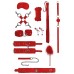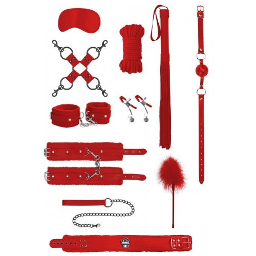 Intermediate Bondage Kit – набор, состоящий из 10 предметов для эротических ролевых игр и практик БДСМ. В комплекте: кляп-шарик, наручники, поножи, маска, пуховка, плеть, крестообразный фиксатор, веревка, зажимы для сосков, ошейник с поводком. Длина веревки - 10 м. Длина пуховки – 28 см.