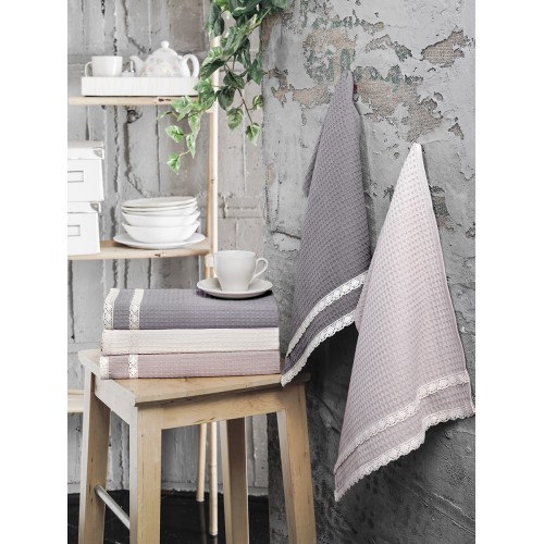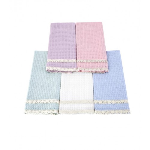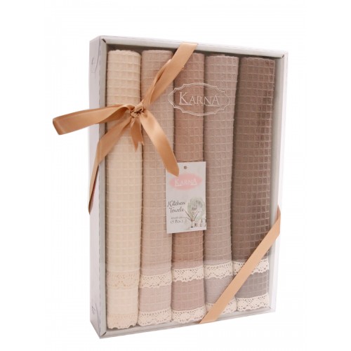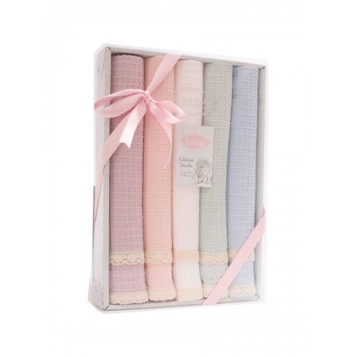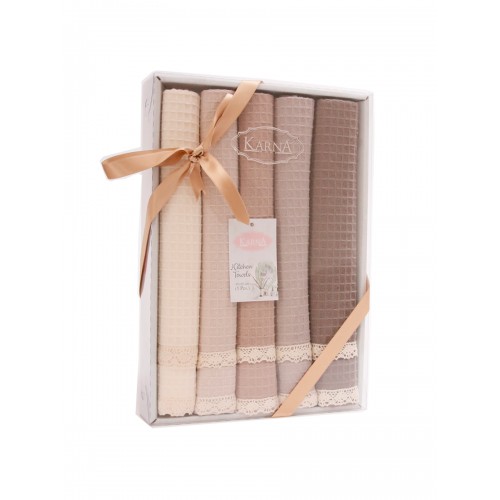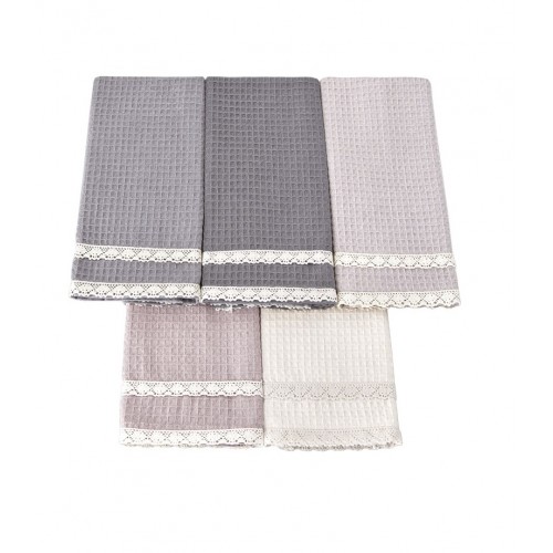 Кухонные полотенца KOPENAKI из 100% натурального хлопка – идеальный вариант для вашей кухни. Главные достоинства модели: • натуральный, гипоаллергенный состав • отличается мягкостью и износостойкостью • экологичный материал • полотенца не выцветают и не линяют • простота ухода за изделием • вафельные полотенца за счет своей структуры впитывают влагу в несколько раз выше чем любые другие. Комплект состоит из 5 полотенец (40x60 cm), украшенных гипюром, и упакован в чудесную подарочную коробку.