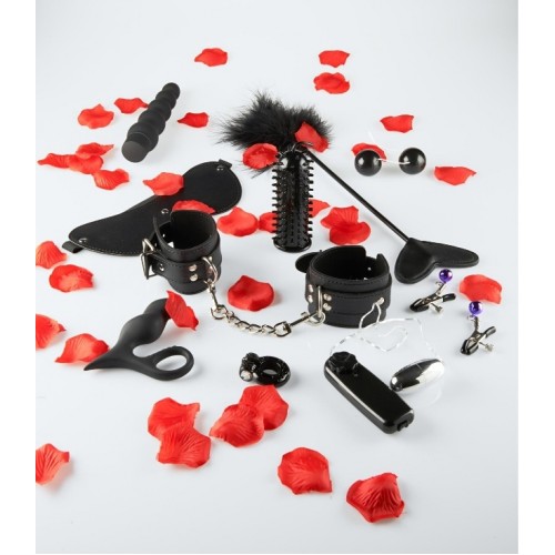 Великолепный набор в подарочной коробке из 10 предметов, чёрного цвета. Включает в себя насадку на пенис, стимулятор простаты, эрекционное кольцо с вибрацией, вагинальные шарики, анальную ёлочку с вибрацией, маску на глаза из кожзаменителя, наручники из кожзаменителя, виброяичко с пультом, зажимы с фиолетовыми колокольчиками, стек с пёрышками. Длина насадки из TPE – 11,5 см., диаметр – 3 см. Рабочая длина стимулятора простаты из TPE – 8 см., диаметр – 2,5см. Диаметр эрекционного кольца – 2 см. Диаметр вагинальных шариков - 3 см. Длина анальной ёлочки – 19 см., диаметр – 3,5 см. Для работы набора требуется приобрести батарейки: 2хАА, 2хААА.