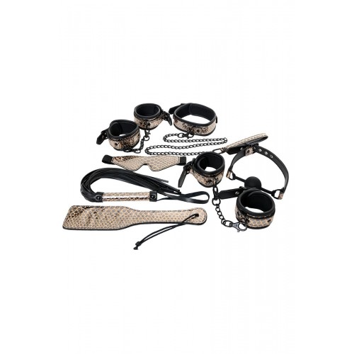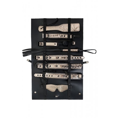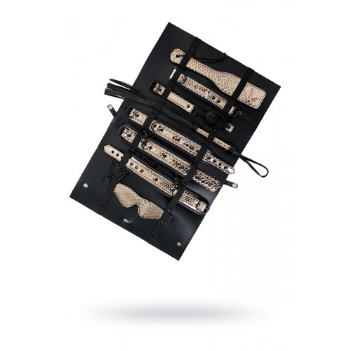 Роскошный БДСМ-набор Waname Fetish Goddess — стильная коллекция аксессуаров для ролевых игр, в которой собрано все самое необходимое для перевоплощения в строгую госпожу или прекрасную рабыню. Набор состоит из 8 предметов из экокожи, стилизованной под кожу рептилий. Каждый из аксессуаров призван подчеркнуть ваш безукоризненный вкус: изящная плетка, красивые наручники и оковы для ног, элегантный ошейник и маска, прелестная шлепалка и кляп, а также удобная сумочка для хранения коллекции. Вы будете чувствовать себя раскрепощенной в любой роли. Вы увидите в своем партнере желание подчиниться вам беспрекословно или жажду владеть вами без остатка. Вам выбирать, какой оттенок страсти будет у этой ночи. Goddess от Waname Fetish — еще никогда ролевые игры не были столь привлекательными. В комплекте: маска, кляп, ошейник, поводок, пэддл, флоггер, наручники, оковы на ноги. Длина маски - 19,5 см. Диаметр кляпа-шара - 4,2 см. Длина манжет наручников - 26,5 см. Длина манжет оков - 31 см. Длина ошейника - 44 см. Длина поводка - 83,5 см. Длина пэддла - 32 см. Длина флоггера - 46,5 см.