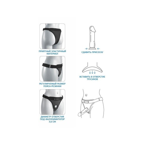 Трусики выполнены из мягкого материала. Благодаря превосходным характеристикам материала и эластичным ремням с липучкой, обеспечивается надёжная и комфортная фиксация на теле. Насадка-фаллоимитатор имеет реалистичную рельефную форму и обладает эффектом мягкой текстуры кожи. В изделии использован эффект двойной структуры: более твердая основа фаллоимитатора покрыта слоем мягкого материала Polyskin, который произведен из немецкого сырья. Размер трусов - S-L.
