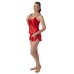 Женский комплект из искусственного однотонного шелка. Состоит из укороченного топа полуприлегающего силуэта на тонких регулируемых бретельках и коротких шортиков на резинке с двумя разрезами по бокам.