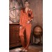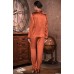 Комплект, включающий блузу на пуговицах с карманом и длинным рукавом и длинные брюки с карманами. Рукав украшен ажурным кружевом, карман — кружевом и вышивкой.