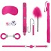 Introductory Bondage Kit №6 – набор, состоящий из 6 предметов для эротических ролевых игр и практик БДСМ. В комплекте: кляп-шарик, маска, пуховка, плеть, ошейник с цепочкой, 2 игральных кубика. Длина пуховки – 28 см.