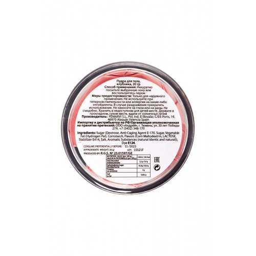 Новый способ развлечь и удивить друг друга – съедобная пудра для тела, которую приятно слизывать и целовать. STRAWBERRY EDIBLE BODY POWDER от Secret Play – вкусная съедобная пудра с мягким вкусом, чтобы превратить вашего партнера в изысканное лакомство. Безграничное удовольствие – посыпать пудрой нежные участки тела и слизывать. Предложите партнеру оставить на своем теле любовный маршрут и двигайтесь по нему языком и губами, пока не останется следов, используйте для прелюдии или для оральных ласк. Мммм вкусно и ароматно! Безопасный и съедобный состав для применения на любых участках тела с восхитительным вкусом и ароматом клубники.