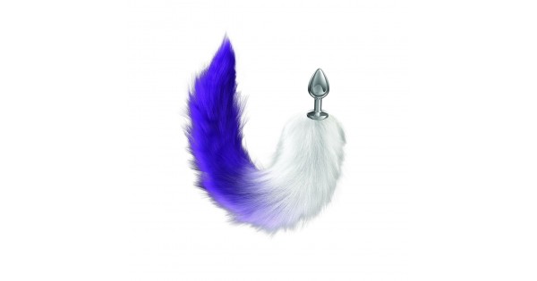 Серебристая металлическая анальная втулка с фиолетово-белым хвостом - размер S