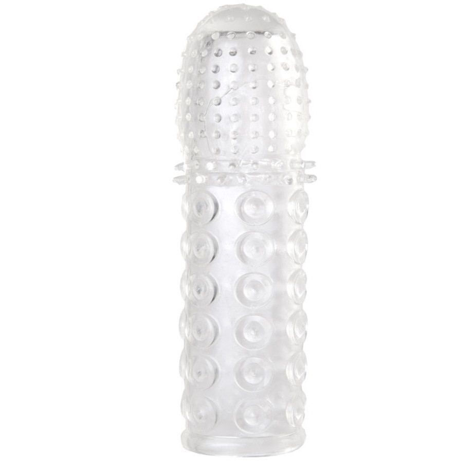 Закрытая прозрачная насадка на пенис с выпуклостями и отростком - 12 см.