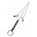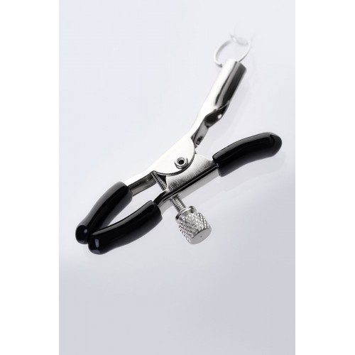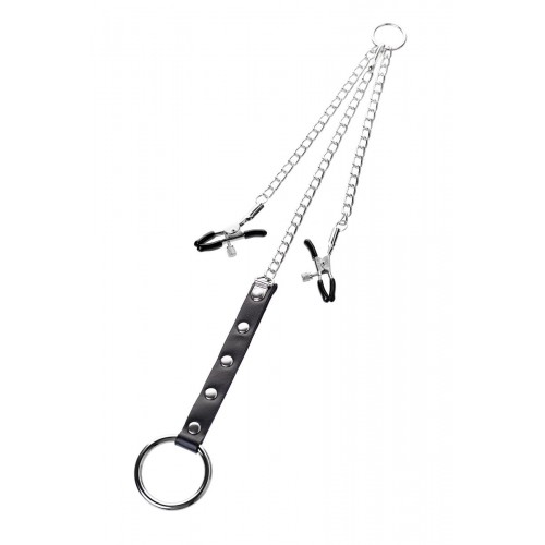 Мужская версия зажимов для воздействия на соски. Сила сжатия регулируется болтиками и может быть усилена или ослаблена во время интимной игры. Дополнительное ограничение свободы обеспечивает металлическое кольцо на пенис. Длина сцепки - 50 см. Длина зажимов - 5 см. Диаметр кольца - 4 см.