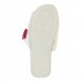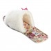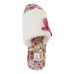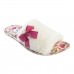 Классические тапочки с открытым мысом на прорезиненной подошве, внутренняя часть тапочка выполнена из хлопкового материала с цветочным принтом, верхняя часть тапочка выполнена из белого искусственного меха и декорирована бордовым атласным бантом.