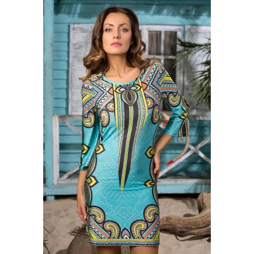 Эффектная пляжная туника из эластичного трикотажа с оригинальным принтом. Туника с втачным рукавом 3/4, который расширен к низу. Круглый вырез горловины окантован. Оригинальность коллекции придает необычно яркий принт.