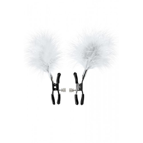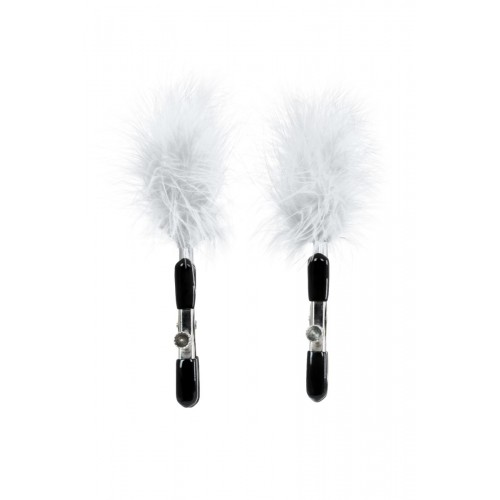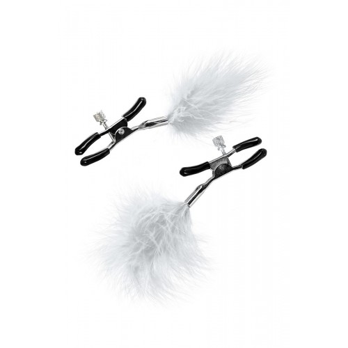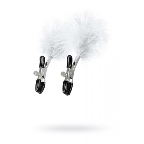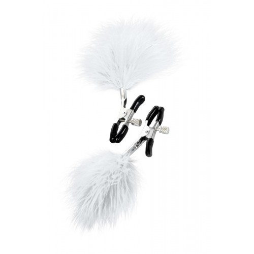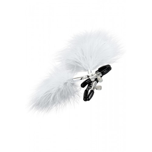 Пожалуй, самые милые из всех зажимов - украшенные перьями. Они стимулируют не только сжатием сосков, но и щекочут грудь. Сдавливание регулируется болтиком и может быть усилено или уменьшено во время интимной игры. Покрытие на концах зажимов защищает нежную кожу.